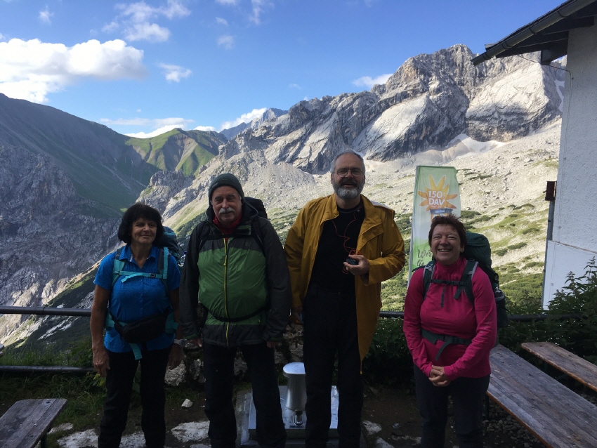 Tag 3: Abstieg von der Knorrhütte über das Gatterl (Grenze zu Österreich) nach Ehrwald bei bestem Bergwetter Gesamtlänge 40km Bergauf 2450m Bergab 1910m Wanderleiter Stefan Kahle